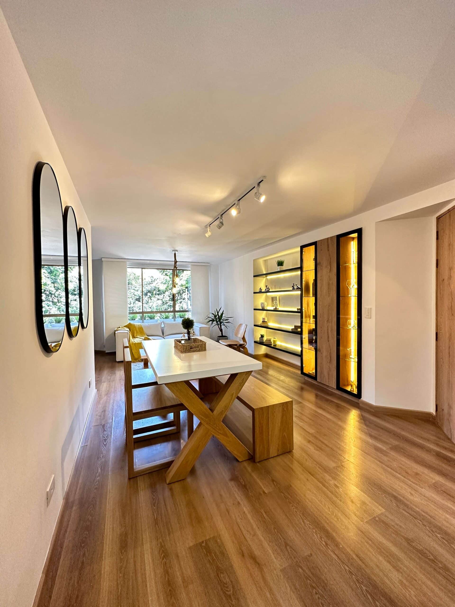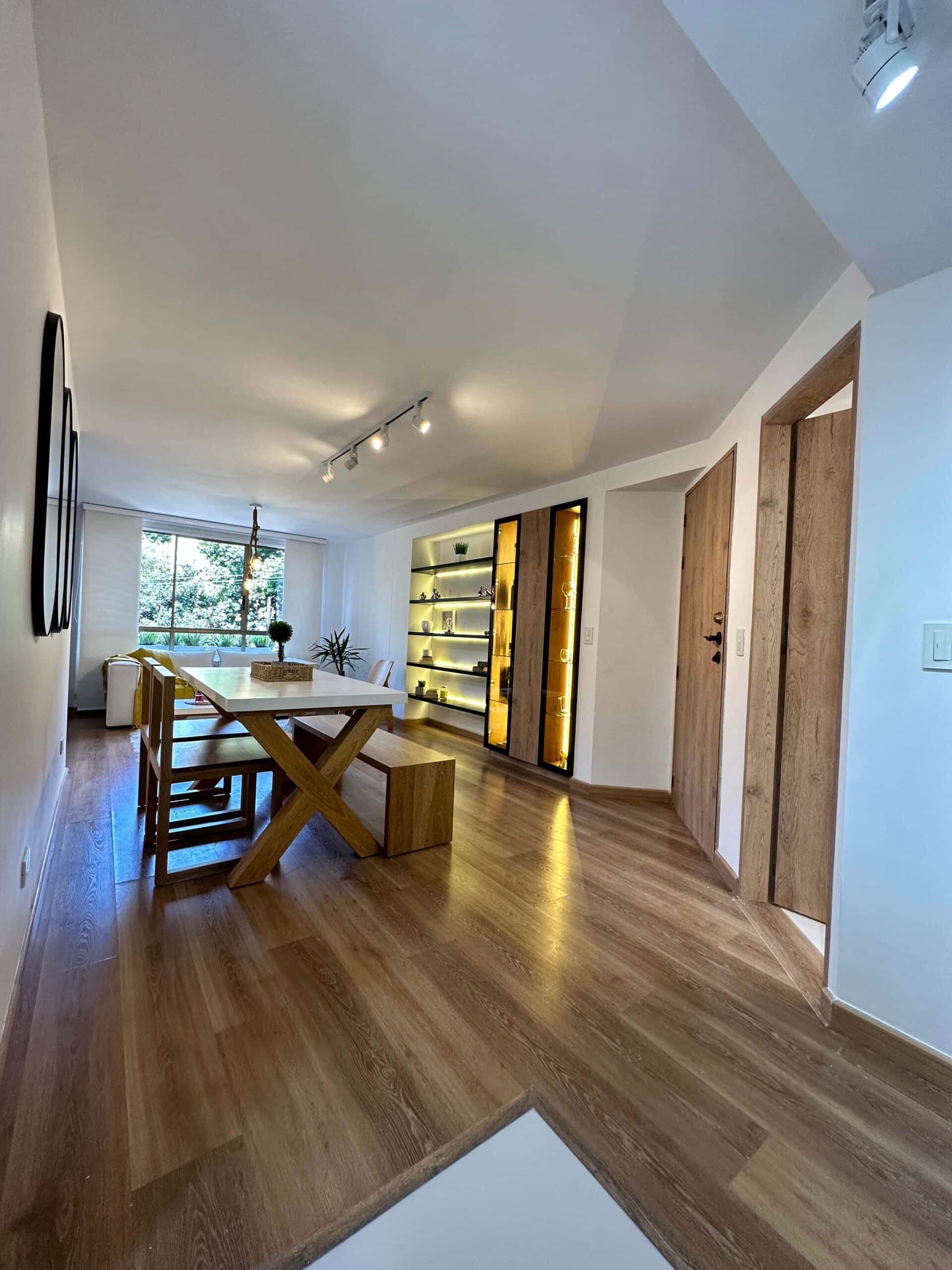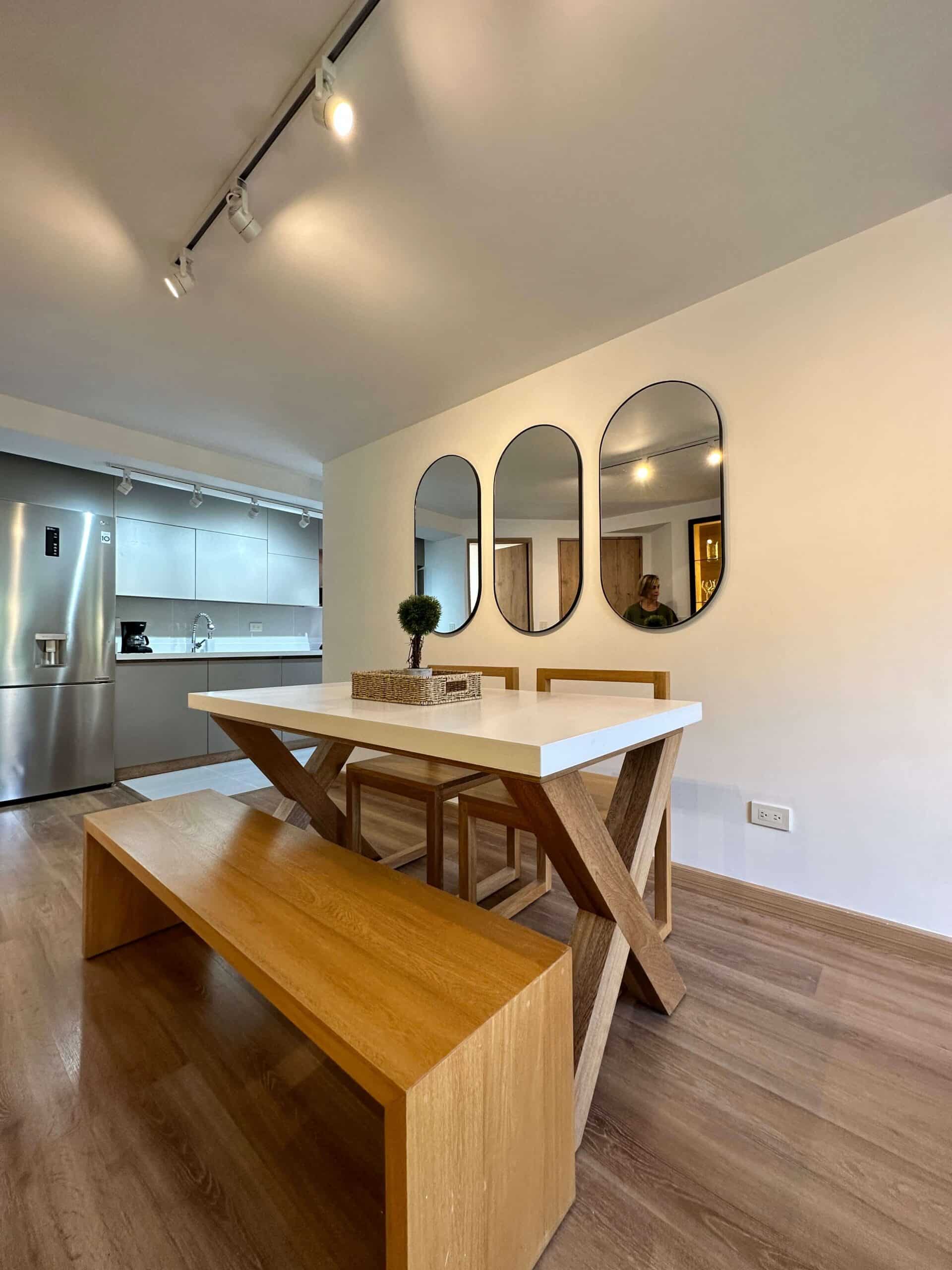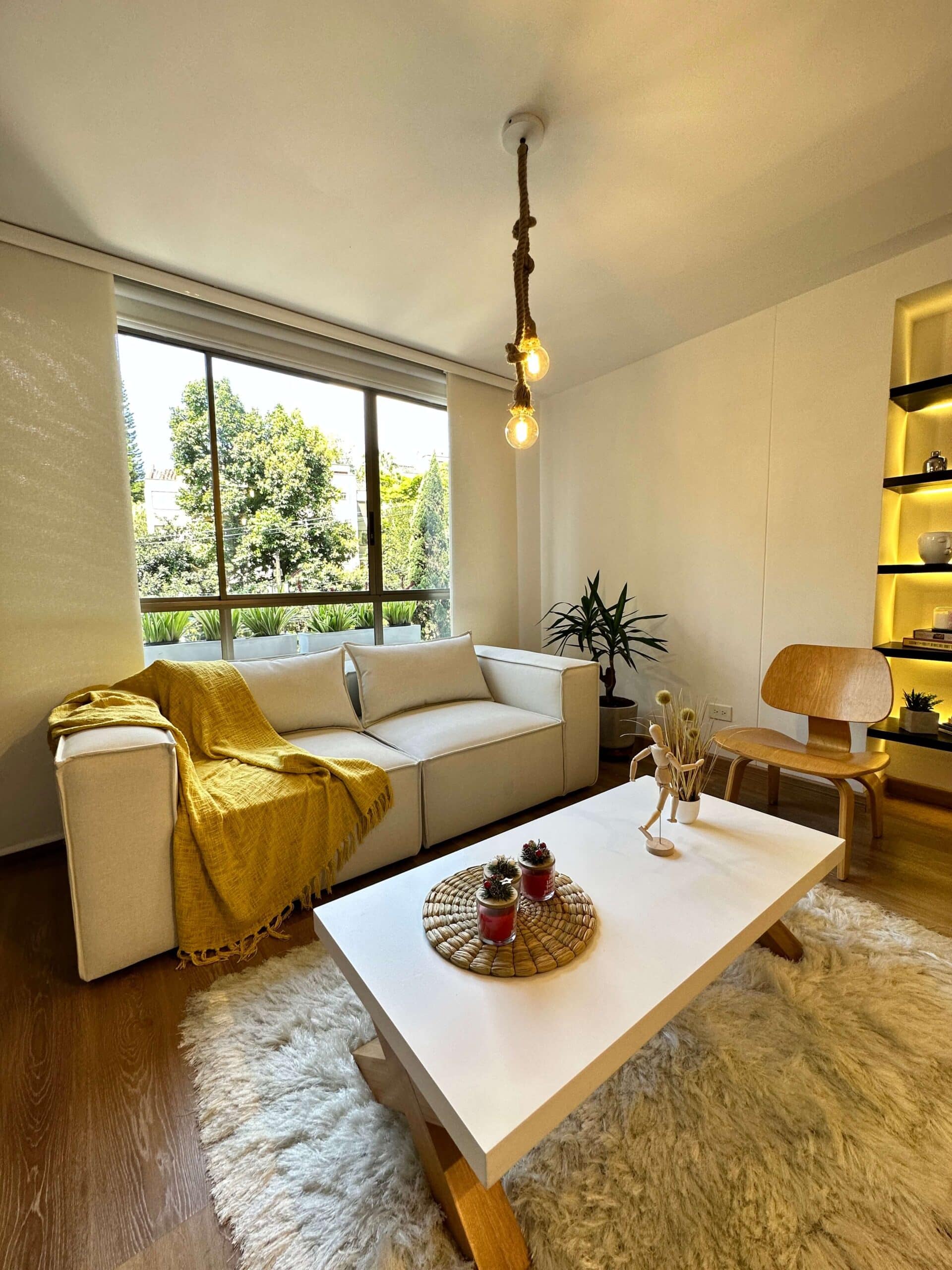 Habitación principal con comoda cama doble, ropa de cama de alta calidad, Smart TV (43”), baño privado y closet. Amplia sala de estar con un lindo sofá integrado al comedor. Acceso a una Smart TV (50”). Escritorio con silla de oficina. Bar con set de mixología. Espacio lleno de moderna decoración. Cocina completamente equipada con horno. Área de lavandería con lavadora y secadora.
