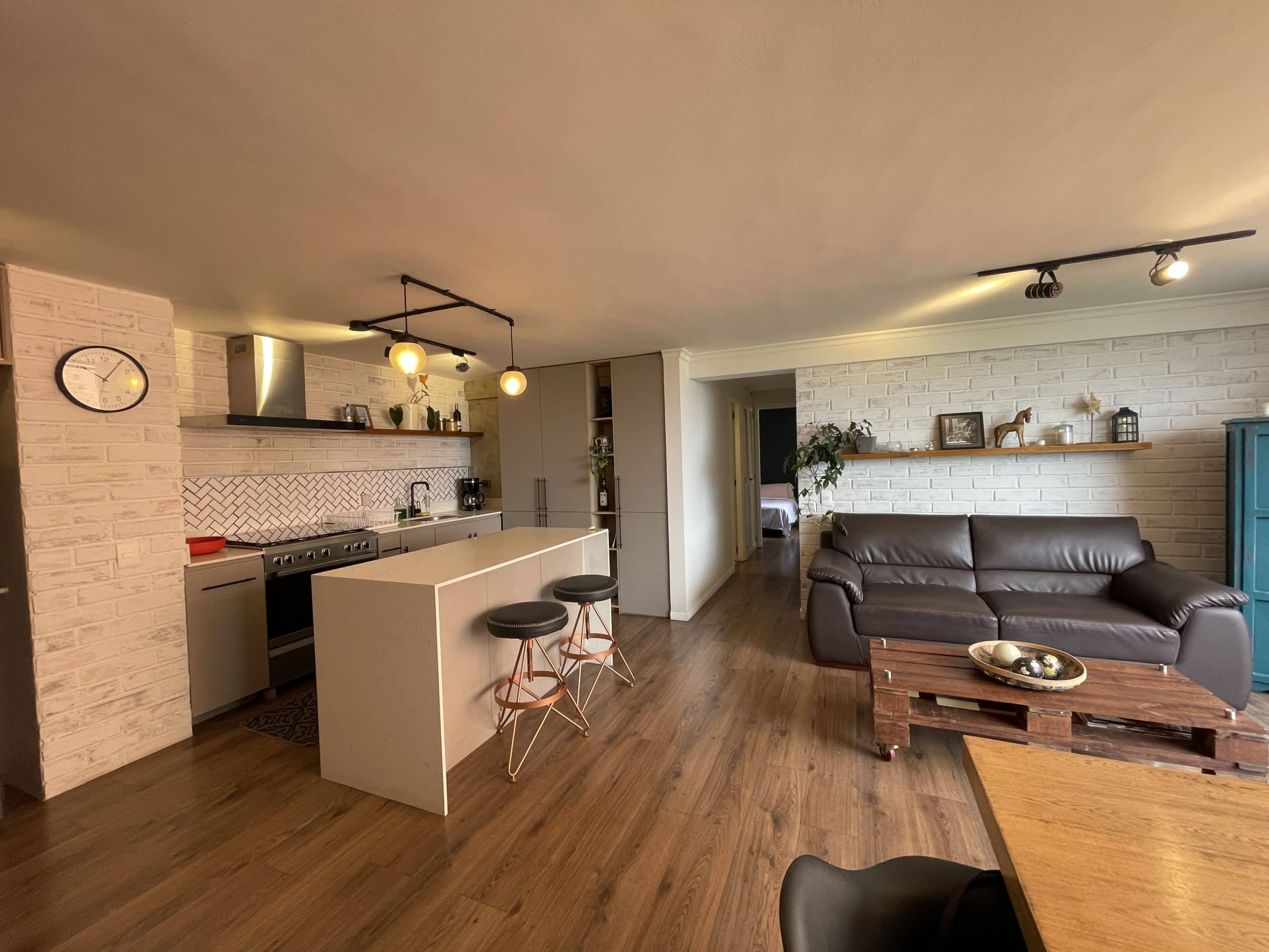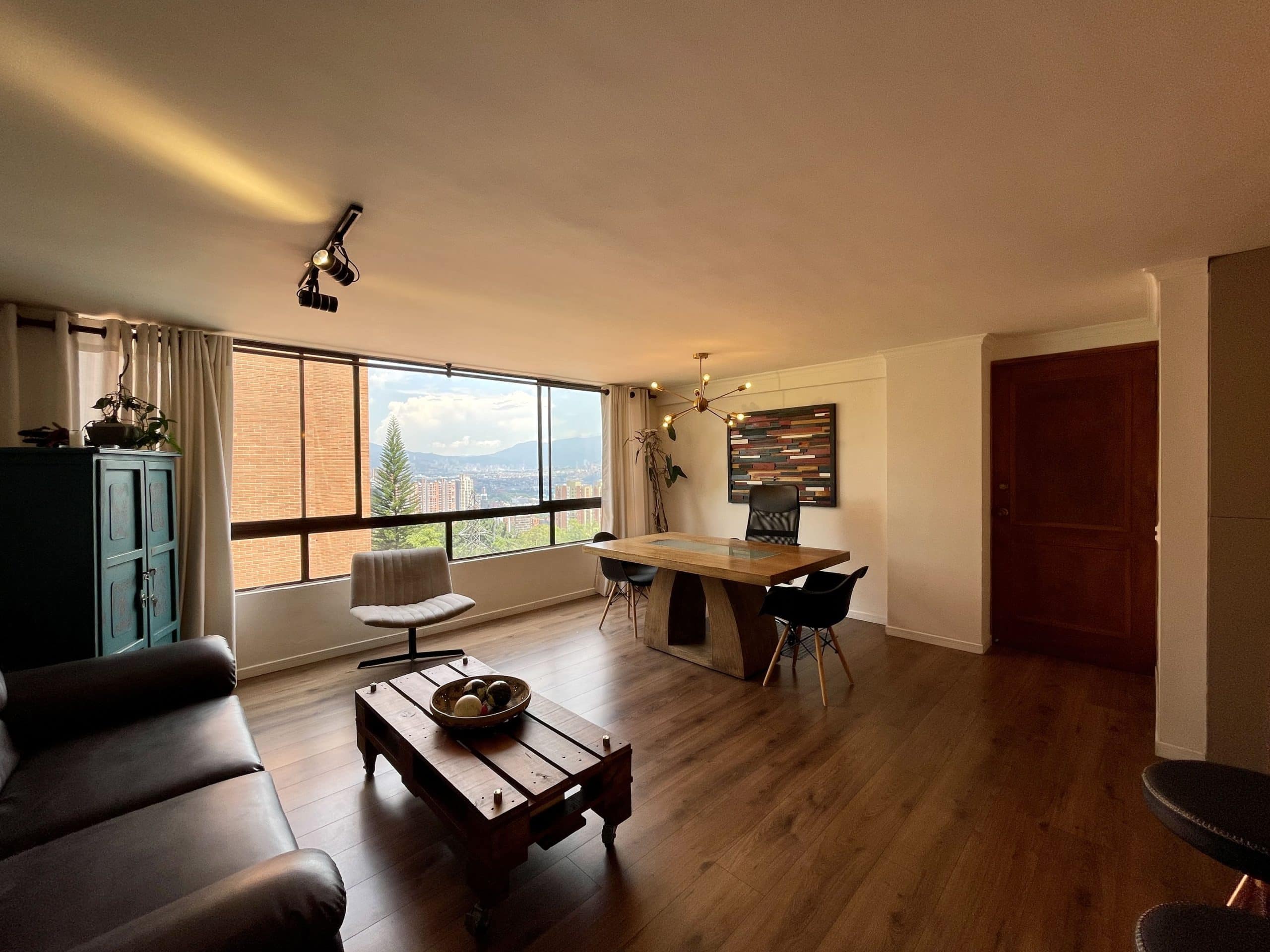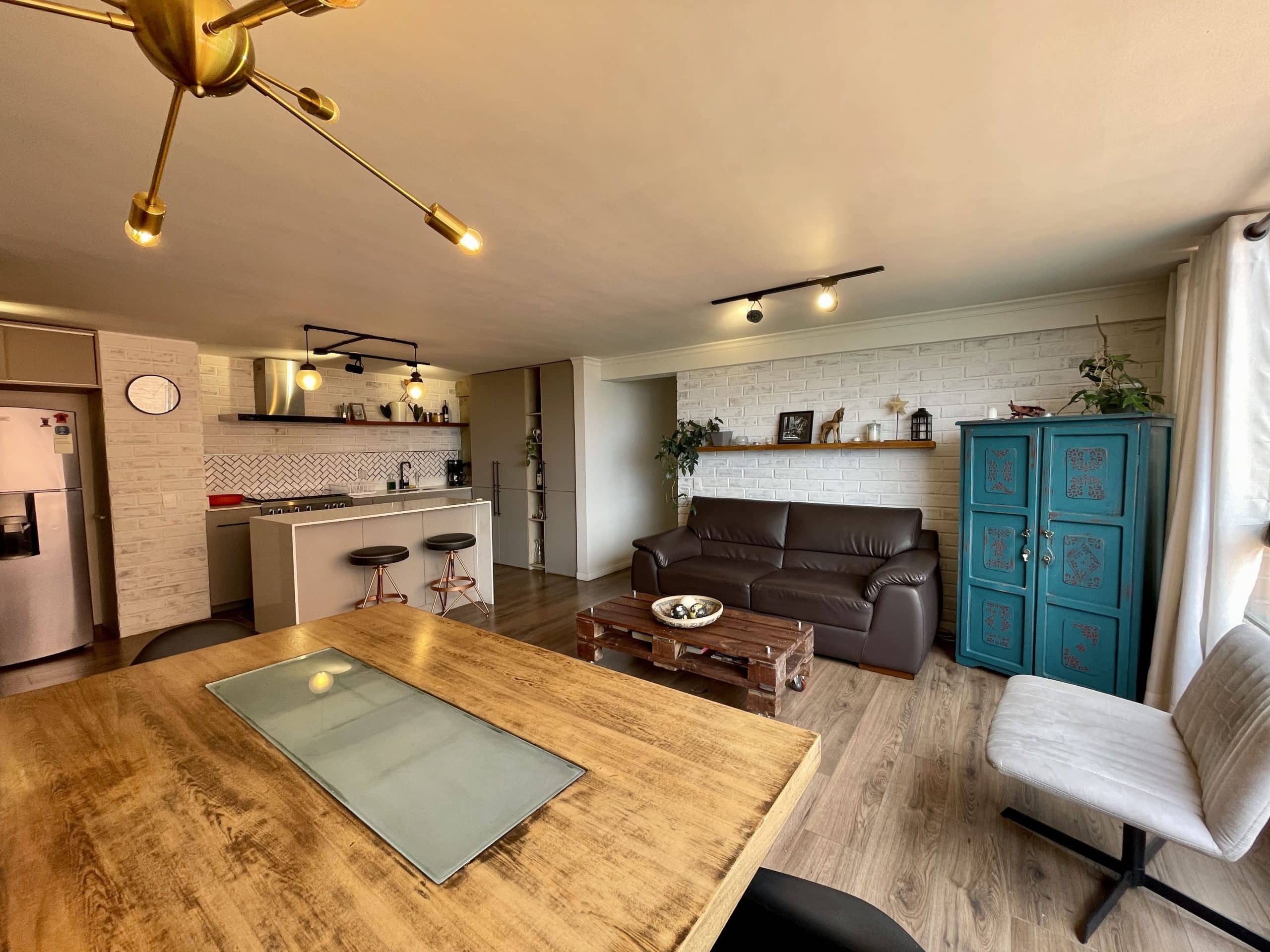 La cocina, los pisos y los baños fueron renovados con materiales modernos; las encimeras de mármol combinadas con detalles en negro aportan un estilo industrial. Sala de estar con vistas a la ciudad