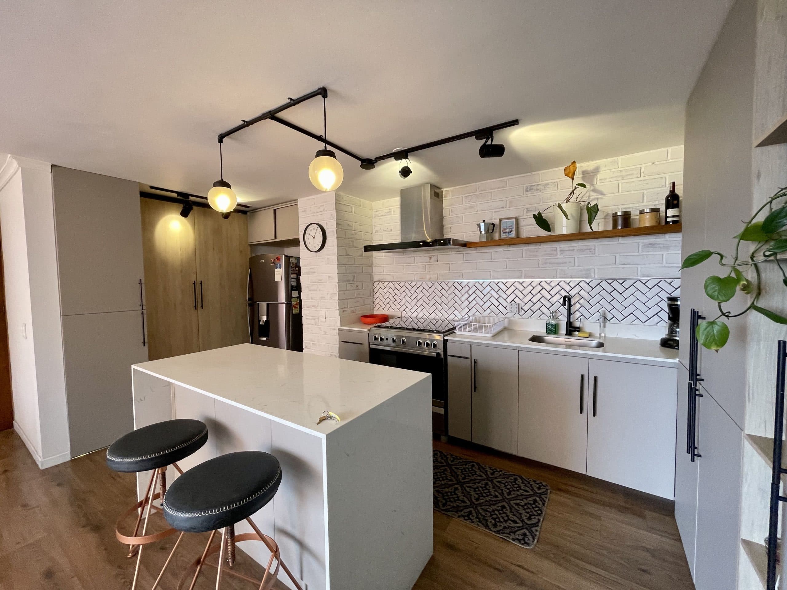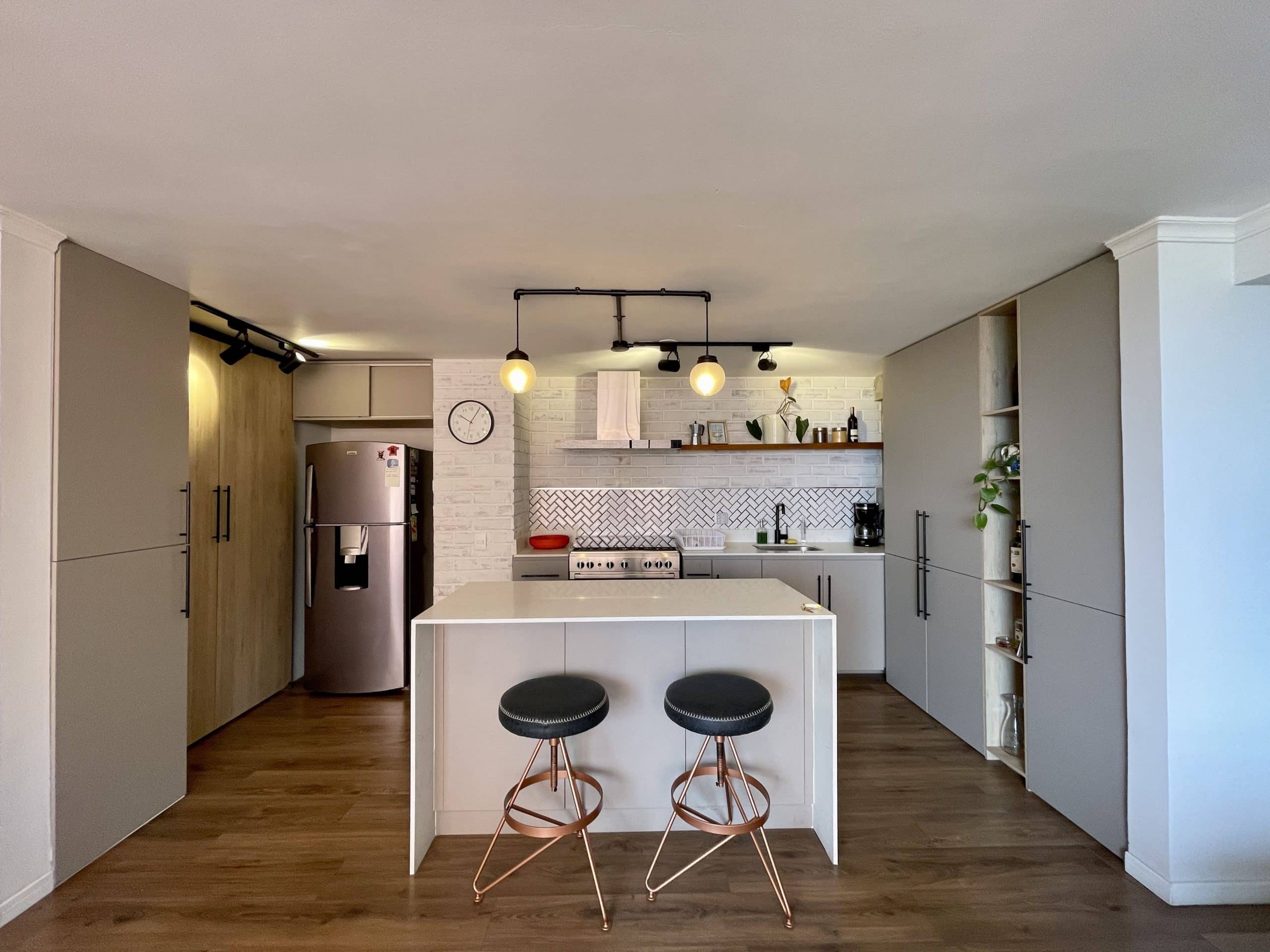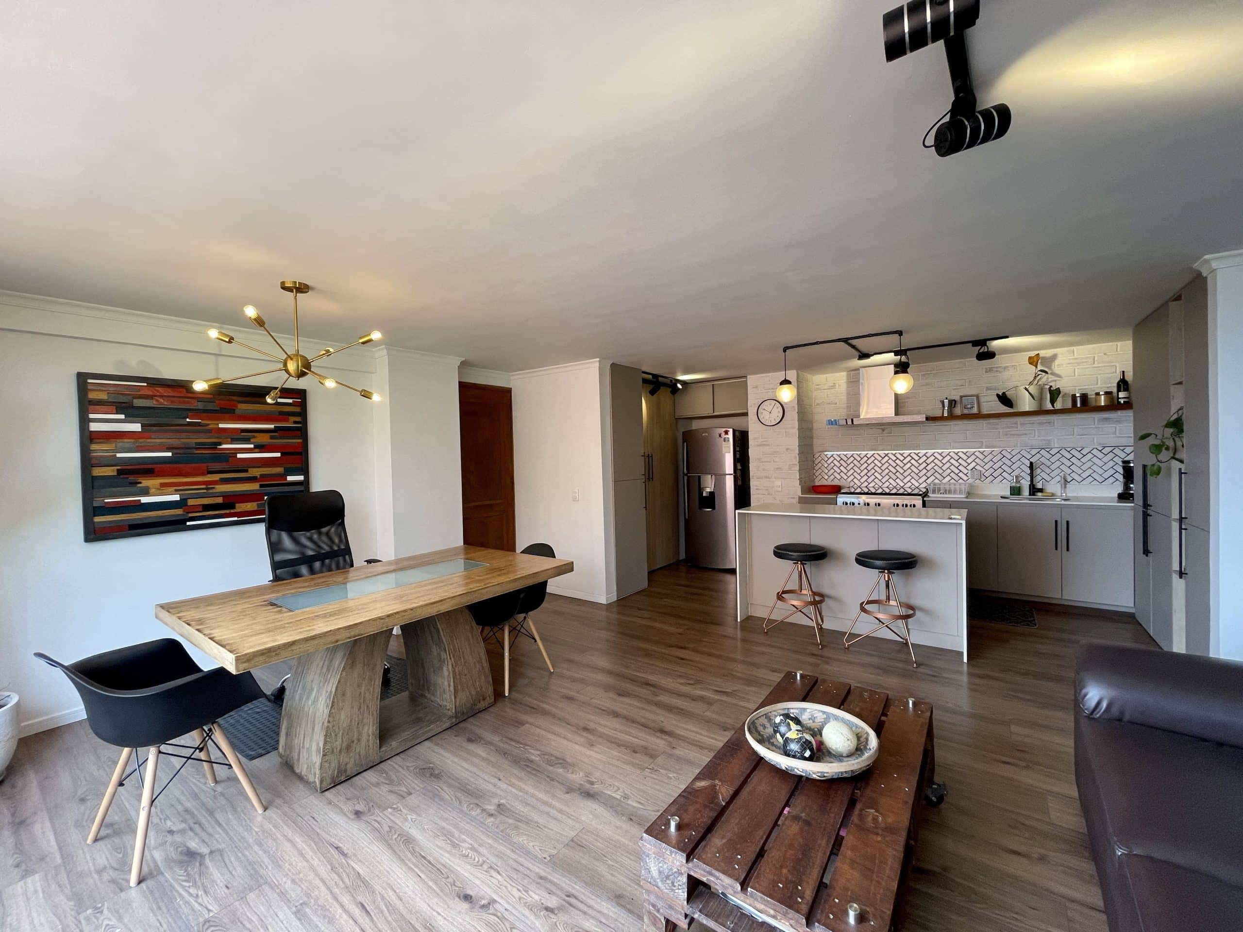 La cocina, los pisos y los baños fueron renovados con materiales modernos; las encimeras de mármol combinadas con detalles en negro aportan un estilo industrial. Sala de estar con vistas a la ciudad